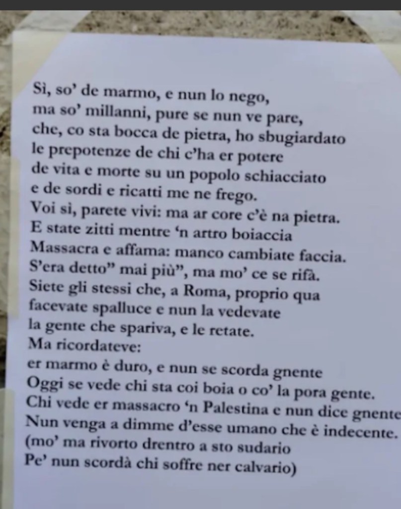 Ieri a Roma la statua di Pasquino nota ai romani da secoli, utilizzata affinché il popolo potesse scrivere invettive più o meno satiriche contro il potere e’ stata coperta da un sudario, qualcuno ha appeso questa poesia sulla statua.